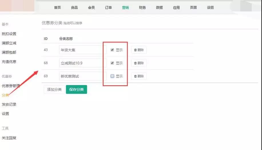 优惠券的ID系统自动生成,填写好分类名称并保存后,勾选“显示”,如果没有勾选的话,则手机前台不显示添加的分类信息,比如上图中取消“新优惠测试”的显示勾选,则此分类名称在前台将不会显示,参见下图: