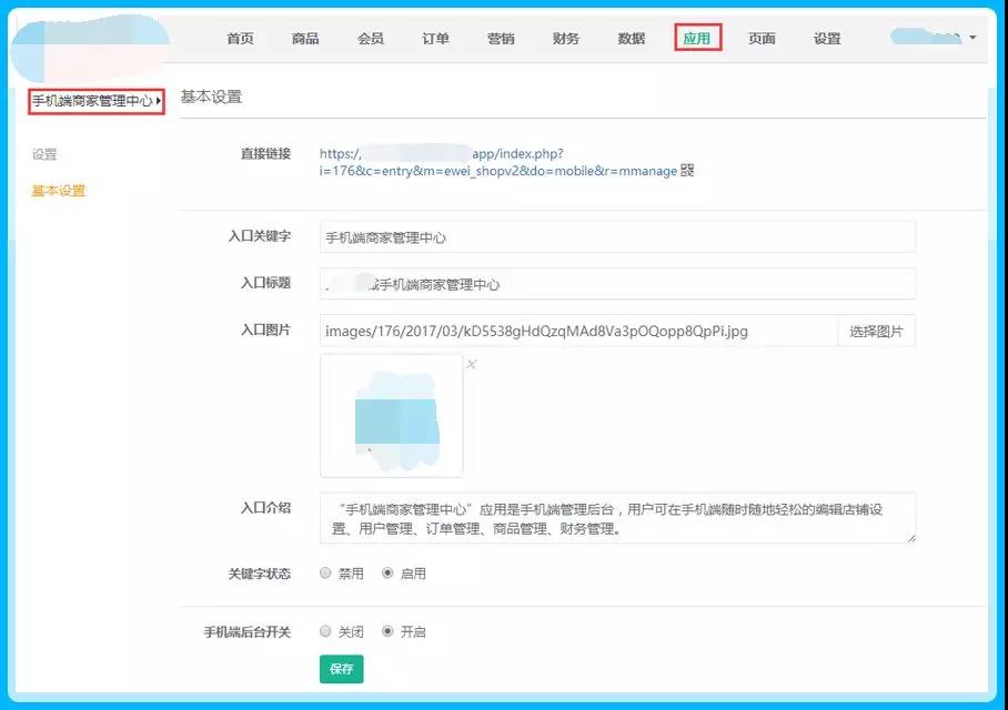 设置入口位置:应用——手机端商家管理中心,参见下图: