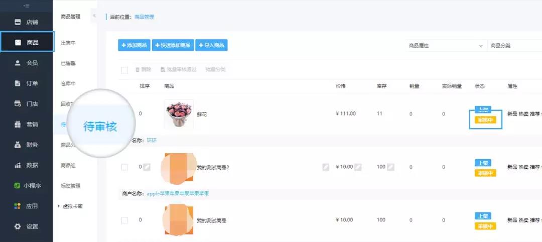 主商城——商品——待审核,点击审核中,在弹出的对话框中,点击确定